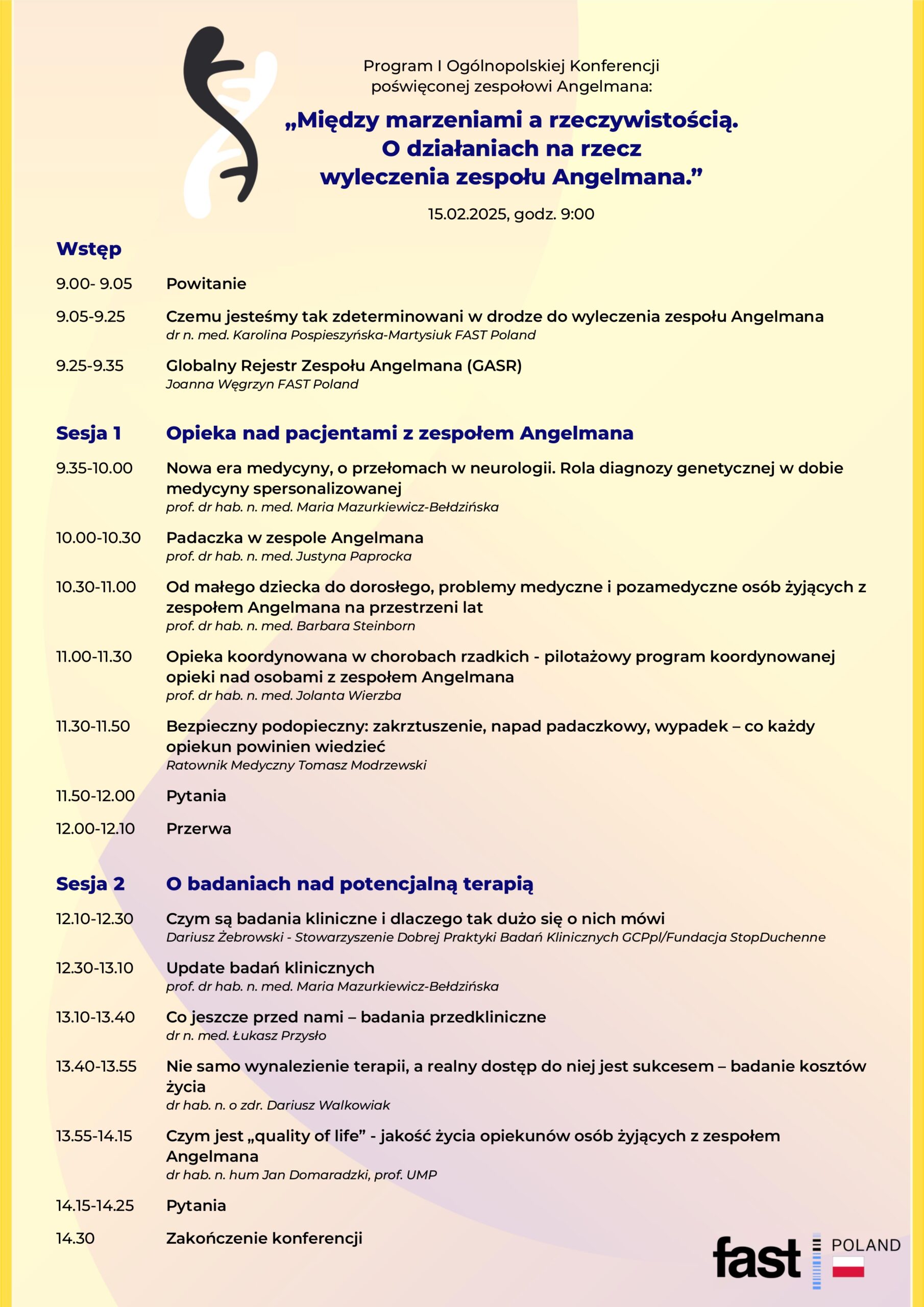 Na wydarzeniu poruszono bieżące tematy związane zarówno z wyjaśnieniem poszczególnych etapów badań klinicznych, jak i z przybliżeniem konkretnych informacji na temat badań przedklinicznych i klinicznych prowadzonych w obszarze ZA. Omówiono tematy dotyczące zmian, jakie zachodzą u osób żyjących z ZA na przestrzeni lat, padaczki, a także dotyczące niesamowicie ważnego aspektu zapewnienia bezpieczeństwa podopiecznemu. Ponadto, eksperci opowiedzieli o opiece koordynowanej w chorobach rzadkich, a także przedstawili zagadnienia związane z jakością życia opiekunów oraz ekonomią. Cały program wydarzenia znajduje się poniżej.